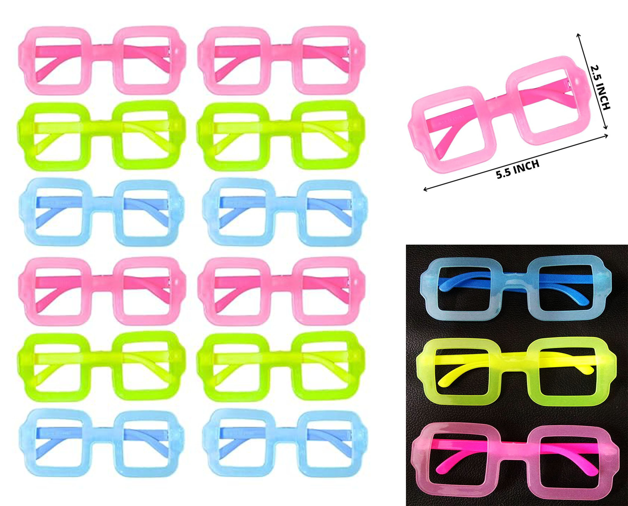 Fosforlu Kare Model Glow Parti Gözlüğü Karanlıkta Yanan Gözlükler 12 Adet (5460)
